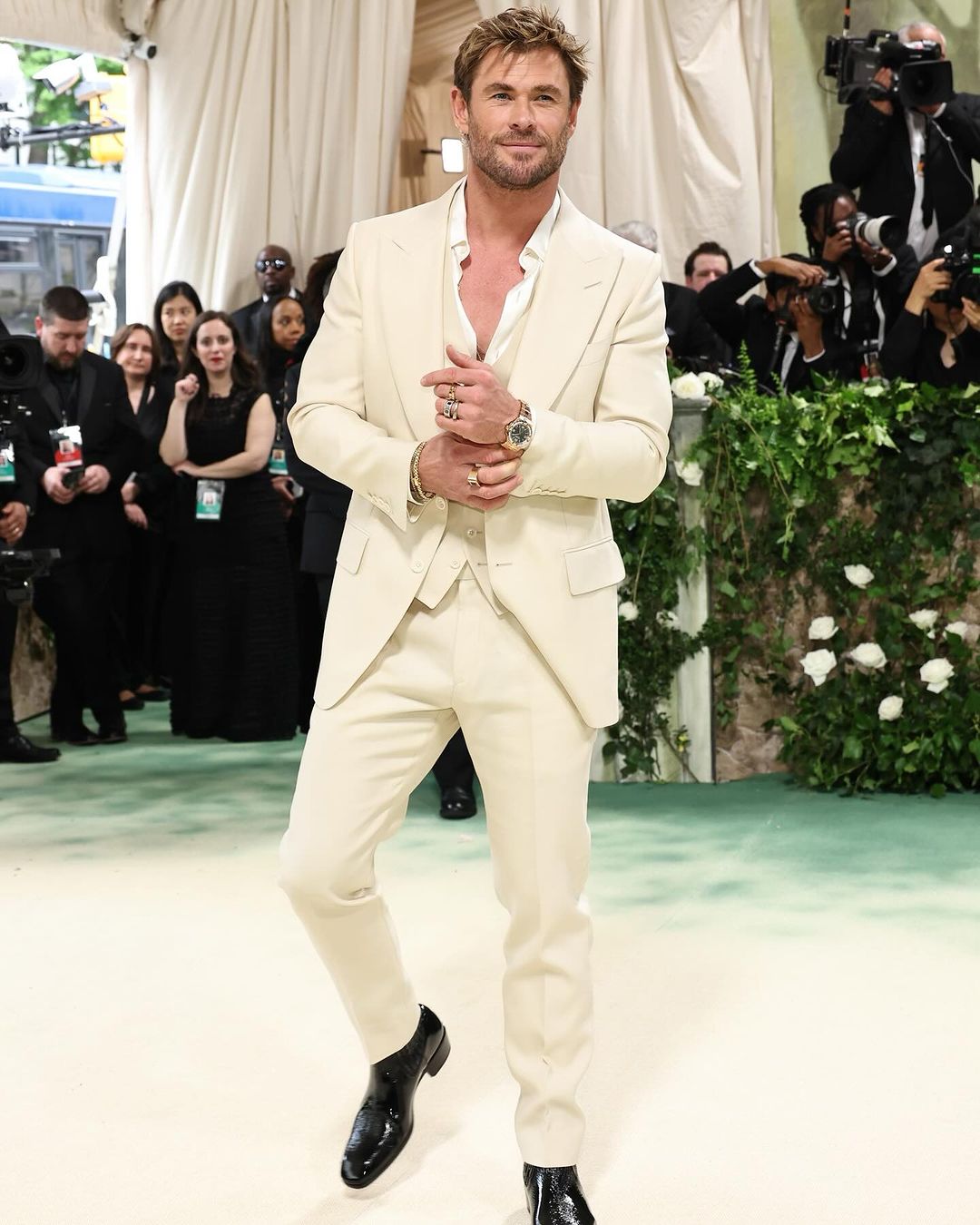 Dressed to complement the gala’s ‘The Garden of Time’ theme, Chris and Elsa stunned in coordinated Tom Ford ensembles. Hemsworth donned a sleek three-piece cream suit, while his wife Elsa Pataky opted for a resplendent golden gown.